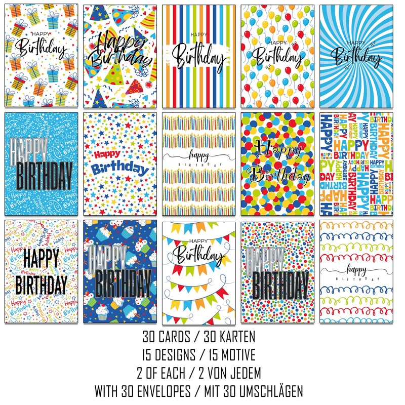 30 Bright Birthday Cards with Envelopes made from Recycled Paper 15 Different Designs
