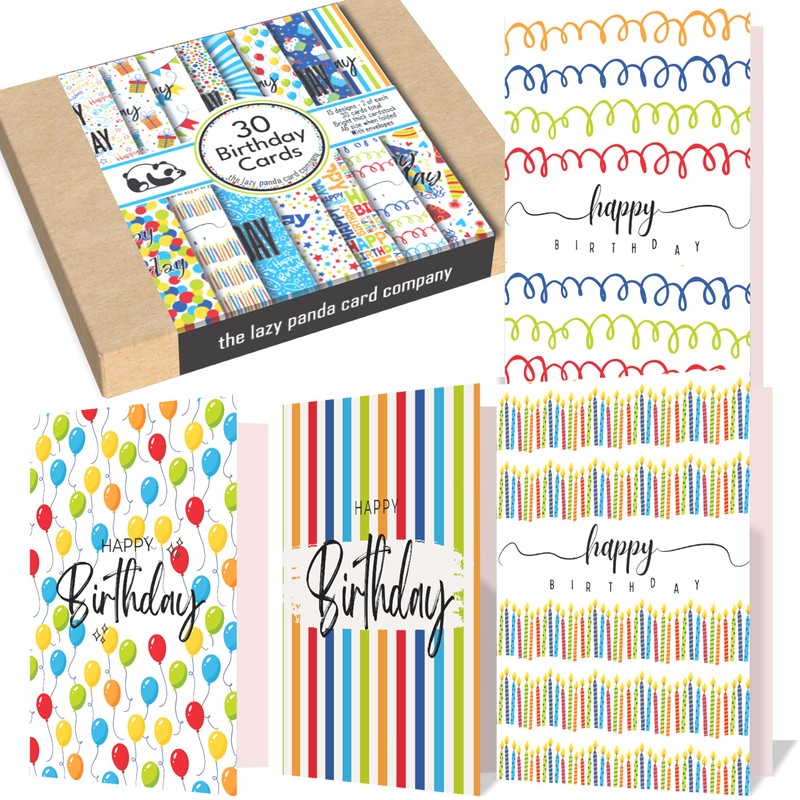 • 30 Bright Birthday Cards with Envelopes made from Recycled Paper 15 Different Designs - Nice simple designs that are appropriate for almost anyones birthday.