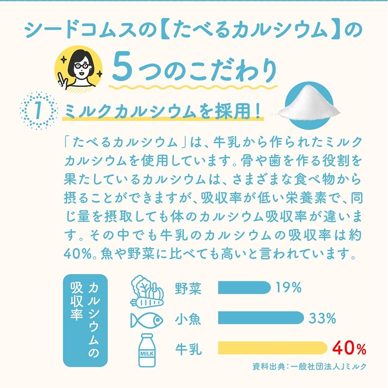 - シードコムス【たべるカルシウム】の5つのこだわり ①ミルクカルシウムを採用 「たべるカルシウム」は、牛乳から作られたミルクカルシウムを使用しています。 ②カルシウムと相性のいいビタミンDを配合 ③味わって食べられる商品のこだわり 子供から大人まで満足いただける味!毎日、飲みたくなるようなやさしい味わい!粉末ですが、水なしでそのまま飲んでも口溶けすっきり!