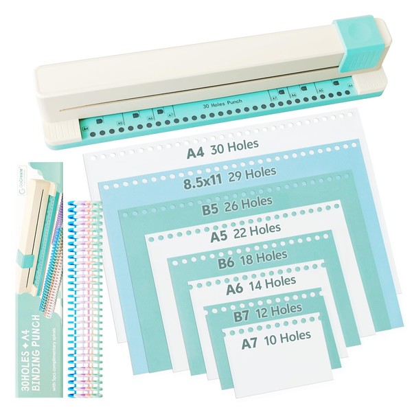 - COMPACT & ELITE DESIGN: The Hole Binding Machine is Designed with Cream and Mint Color, Sleek Finish and Compact Size to Carry. Punch Holes Efficiently in Making Journals,Planners,Books,Spiral Notebooks,Organizing Office Documents,Notes, Drawing Papers Neat. 30 Holes For A4,29 Holes For 8.5x11 Inch, 26 Holes For B5 22 Holes For A5 ,18 Holes For B6, 14 Holes For A6,12 Holes For B7 ,10 Holes For A7.