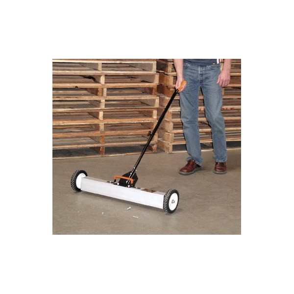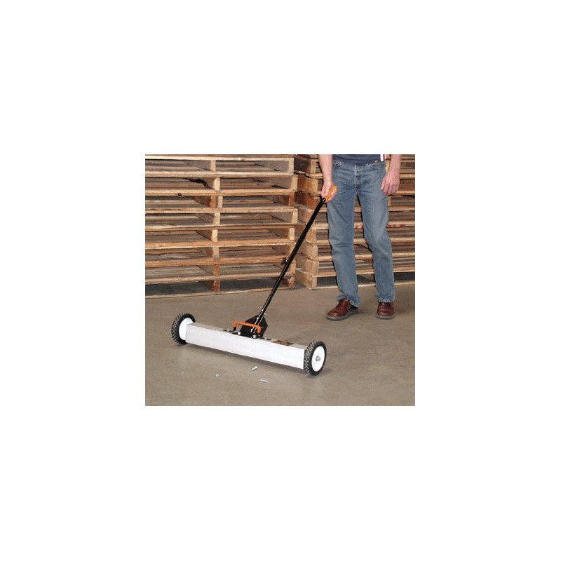 With 7" wheels and an extra-wide 30" sweep head, this magnetic sweeper is ideal for quickly and easily picking up hardware, scrap and other metal parts over shop floors, carpet and even grass. The magnetic sweeper provides 50 lbs. of magnetic pulls a release to quickly clear debris. The handle extends from 30" to 44-1/2". 7" inch wheels Extra-wide sweep head for quick clean up 50 lb. magnetic pull Works on carpet and grass release quickly clears debris Handle extends from 30'' to 44-1/2'' Weight: 20.5 lbs. Handle: telescopes from 30" to 44-1/2" in length Head Dimensions: 30" L x 3" W x 4" H Weight: 20.5 lbs.