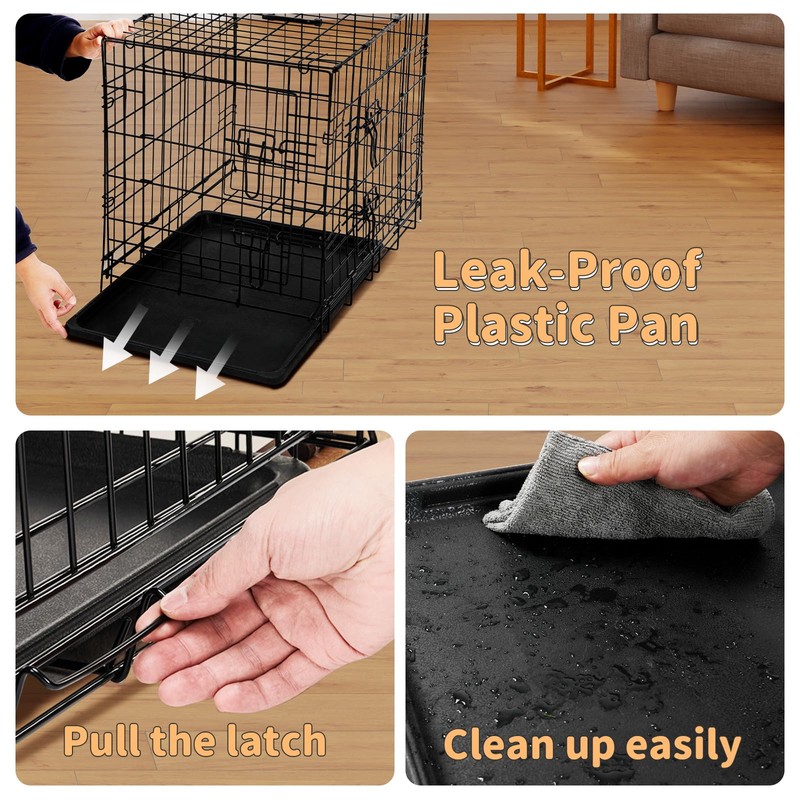 • 🐕【Sturdy & Durable】This durable and foldable dog crate is made of rust-resistant metal. Thick metal wire and double doors with 2 heavy-duty sliding bolt locks keep your dog safe and secure.