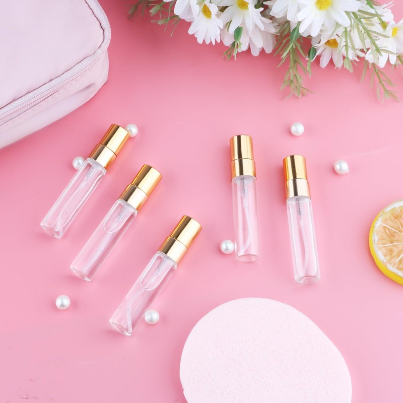 30 Pcs 5ml/0.17oz Mini Spray Bottle Glass Fine Mist Perfume Atomizer Empty Sample Containers with Golden Lids for Travel Cleaning Essential Oils
