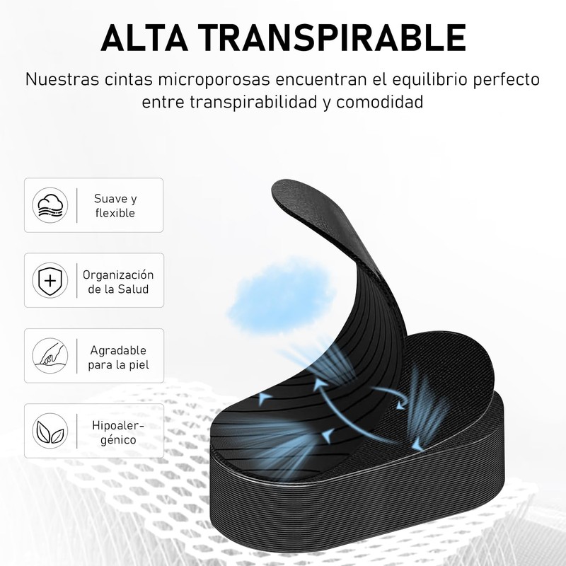 - Diseño cómodo: Las principales características de la cinta son su flexibilidad única, transpirabilidad, lo que la hace adecuada para uso terapéutico, ya que se puede usar durante largos períodos de tiempo sin molestias. Fabricada con material suave y elástico, la cinta para dormir se ajusta cómodamente a tu piel, adaptándose a los contornos faciales sin causar irritación