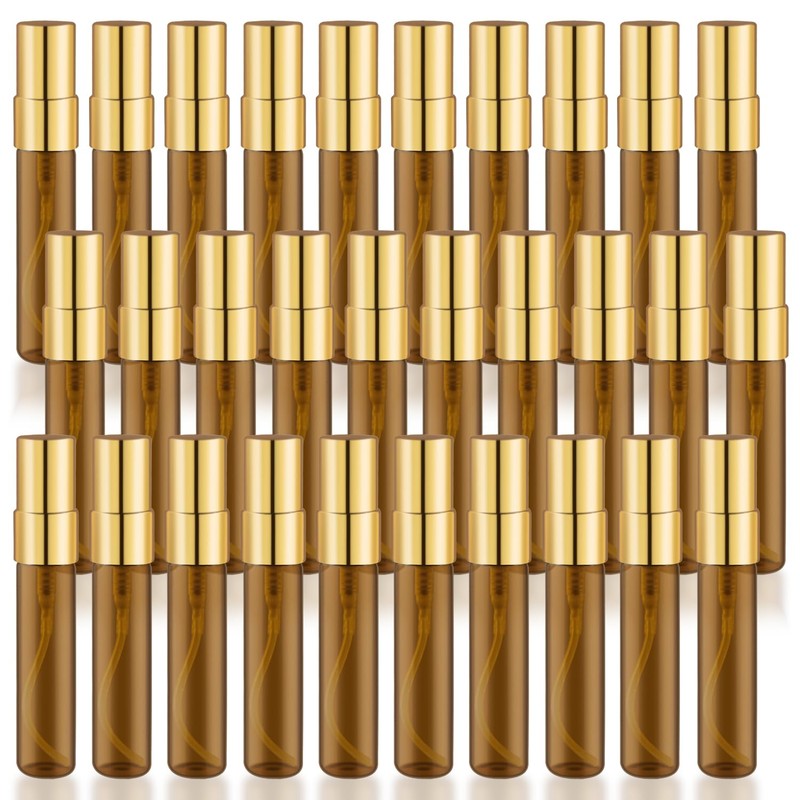 30 Pcs Golden Vials Mini Spray Bottle Amber Glass Fine Mist Perfume Empty Sample Containers with Lids for Travel Cleaning Essential Oils - 5ml/0.17oz