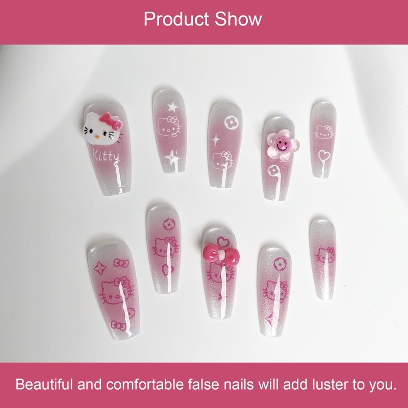 30 PCS Press on Nails Kitty Cat Fake Nails Cat's Eye Fake Nails Sunflower Fake Nails Bow Fake Nails Long Fake Nails Gifts for Women and Girls (No.77)
