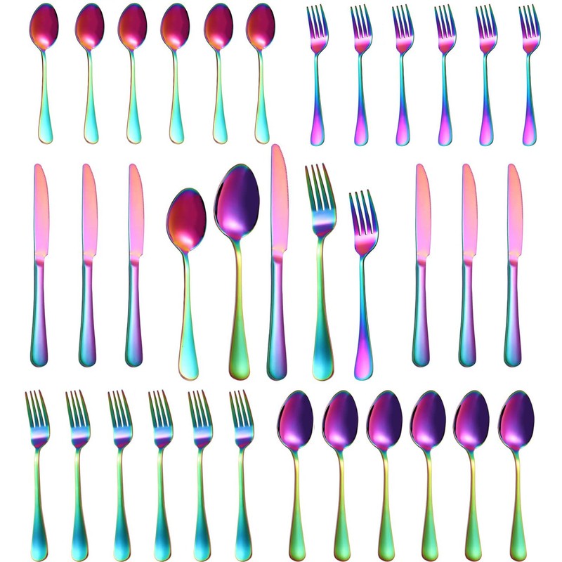 - 30 PIECE Rainbow SILVERWARE SET, SERVICE FOR 6---This silver ware set contains: 6 dinner knives, 6 dinner forks, 6 salad forks, 6 dinner spoons and 6 teaspoons. Perfect Rainbow stainless steel silverware for home, restaurant, family daily use, entertaining, wedding, outdoor dining, camping, dinner party, holiday usage and festival gathering. The silverware set Rainbow color is elegant and shiny.