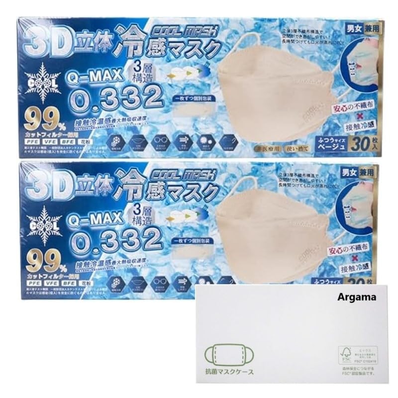 [ヒロ・コーポレーション] マスク クール 冷感 ベージュ ふつうサイズ 30枚 x 2箱 セット オリジナルケース付き