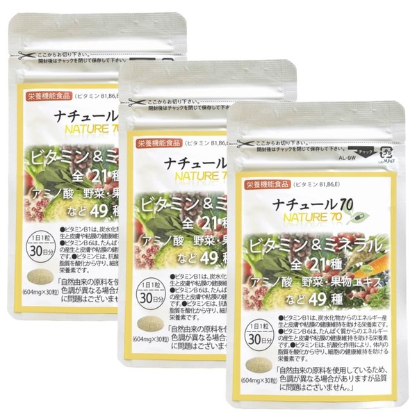 マルチビタミン ミネラル 野菜 果物 酵母 アメリカ サプリ 30日分×3個 自然 天然 由来原料使用 ナチュール70 総合ビタミン… (3)