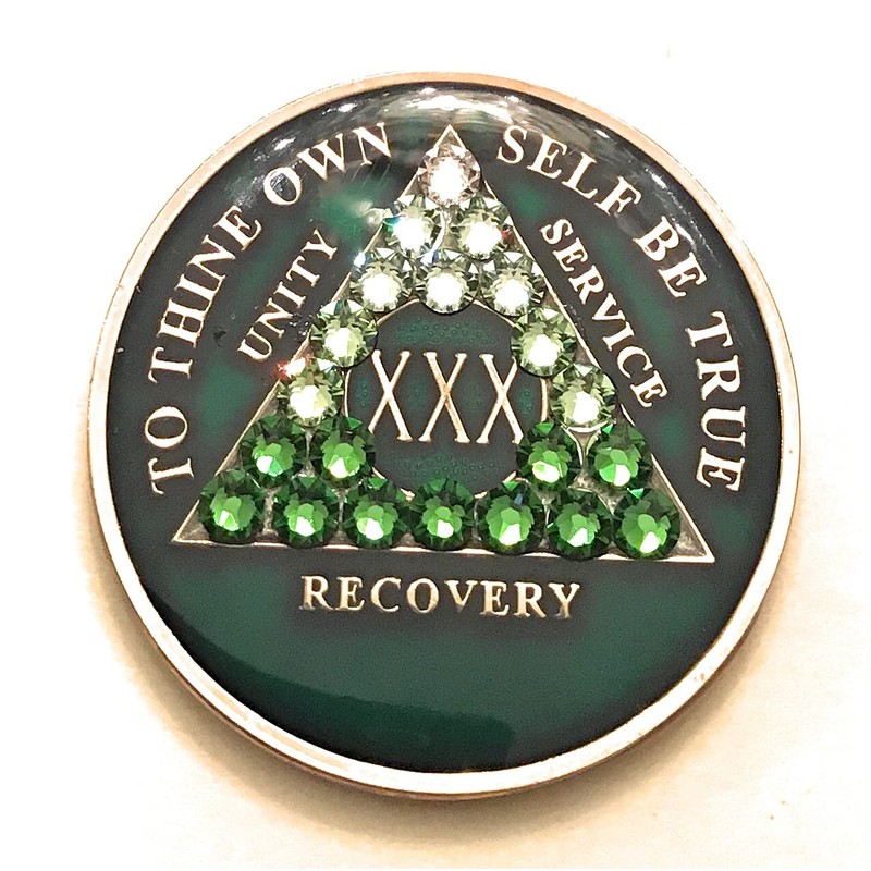 30 Year Green AA Medallion - Alcoholics Anonymous Bling Chip with Transitional Crystals- Sobriety Chip, Token