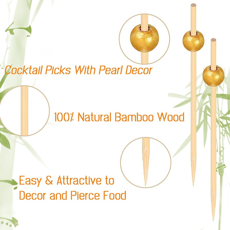 - This package totally has 300Pcs wooden gold pearl tips toothpicks. Natural material of the bamboo cocktail picks won't affect the flavor of your food. Bamboo sticks made of wood are more environmentally friendly and safer and healthier for the human.