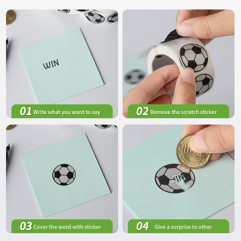 - Easy to Use: These soccer scratch-off stickers adhere easily to paper and won't peel off; So stick them on a smooth, clean, dry surface. To use, simply peel off the scratch-off sticker from the original paper and cover and paste it anywhere you want to hide it. Once attached, you don't need to remove the tape to reveal the contents