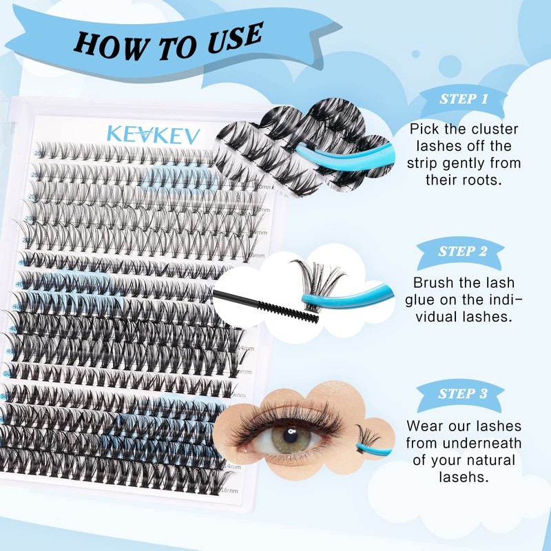 - Convenient and reusable: You can DIY lash clusters by yourself at home. It's easy to apply .KEV individual lashes no glue residue,no burden, and can be easily removed. And every cluster can be reused many times with proper care.