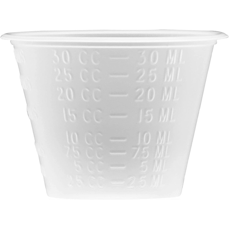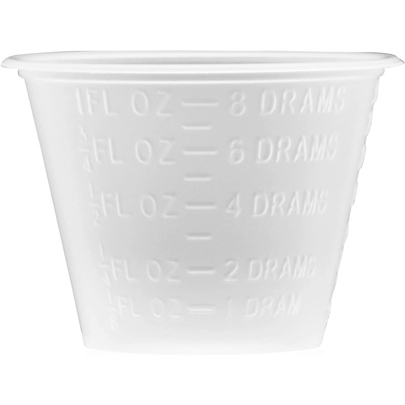 - GRADUATED MARKINGS - Each 1 ounce non sterile medication cup features accurate, easy to read, graduated measurement indicators. Clear measuring markings are calibrated in drams (1-8), fluid ounce (1/8-1), tablespoon (1/2-2) and ml/cc (2.5-30). Small one oz med cups are essential for measuring liquid medicine accurately. These can also be used as a medication dispenser.