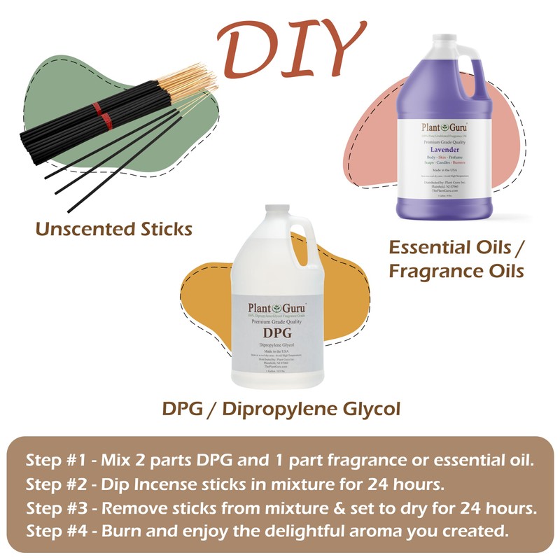 - ✅ INCENSE RECIPE - Mix 2 parts DPG and 1 part fragrance or essential oil - Dip Incense sticks in mixture for 24 hours - Remove sticks from mixture and let dry for another 24 hours. - Once fully dried, burn and enjoy the delightful unique aroma you created.
