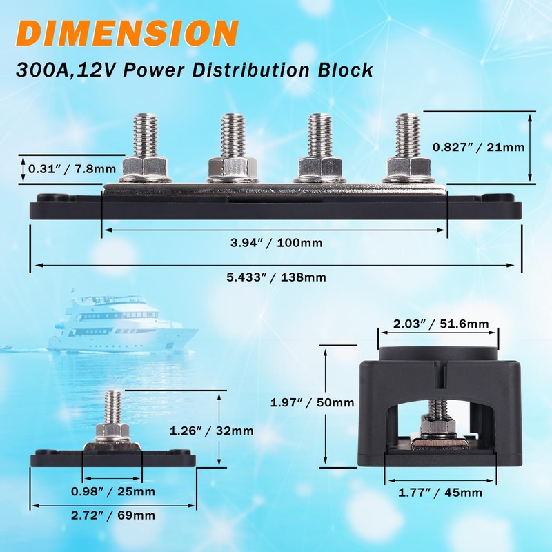 - ✅【 VERSATILE VOLTAGE COMPATIBILITY 】 : Size of Power Distribution Block is 138 x 69 x 44.5mm . Stud size: M8(5/16"), Power Distribution Block is designed to handle up to 300A of AC & is compatible with 12V, 24V, and 48V DC power systems, providing flexibility in its use.