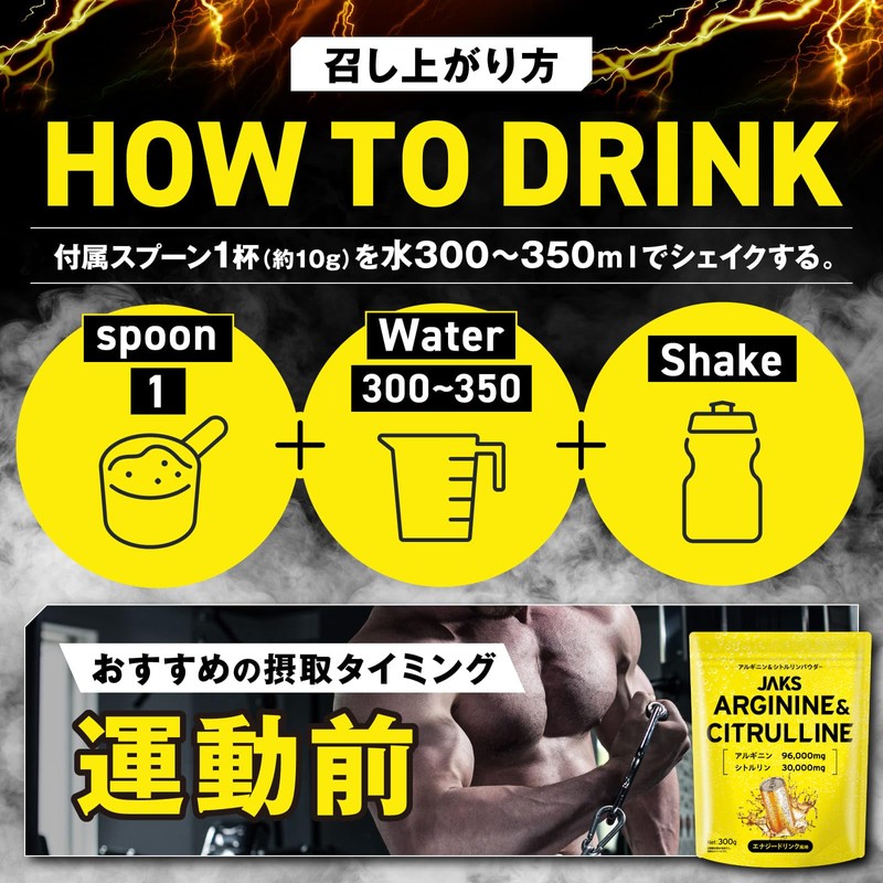 - 【JAKSアルギニン×シトルリンパウダー】圧倒的な配合量と飲みやすさを兼ね備えたプレワークドリンクの決定版。
