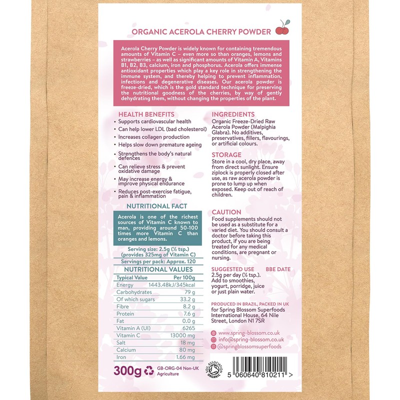300g Organic Acerola Cherry Powder Freeze-Dried 100% Natural Vitamin C Raw Extract Food Supplement Immune System Booster Vegan Gluten-Free Superfood Ascorbic Acid Alternative No Additives Non-GMO