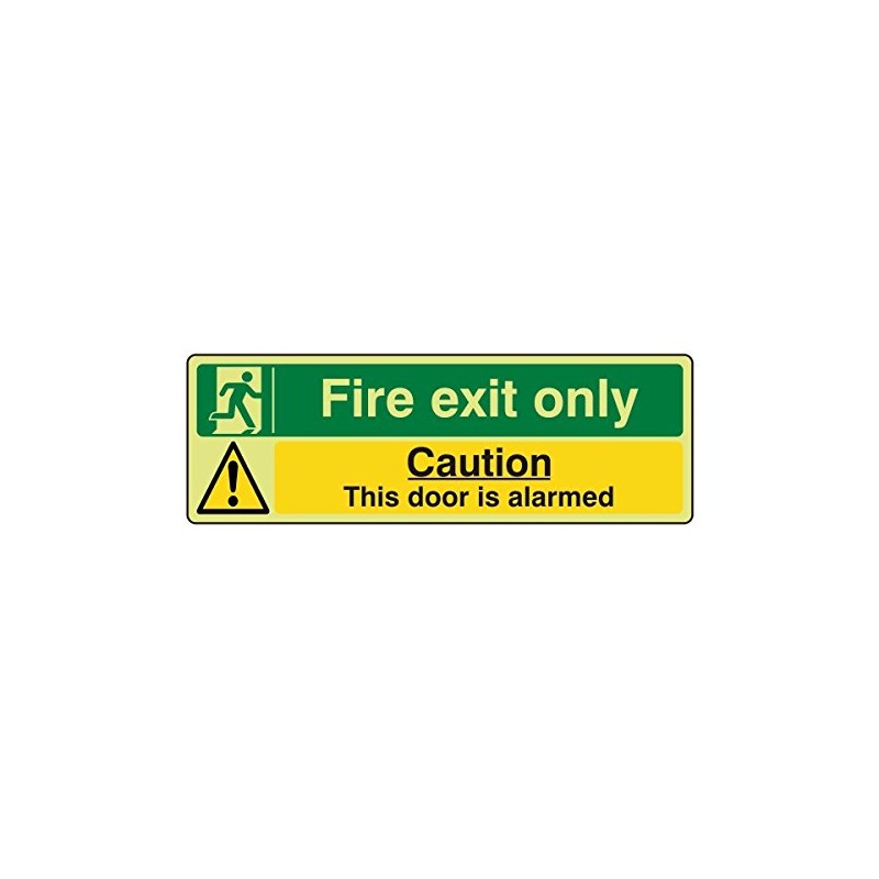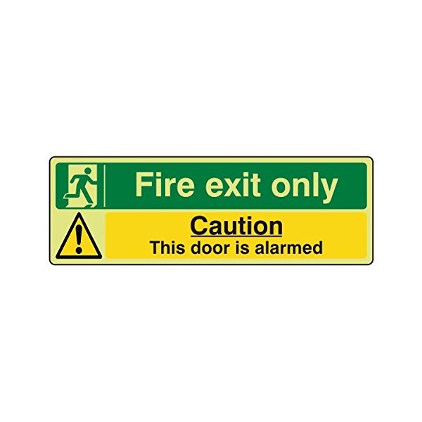 - 300mmx100mm Photoluminescent Fire Exit Only/This Door is Alarmed Sign