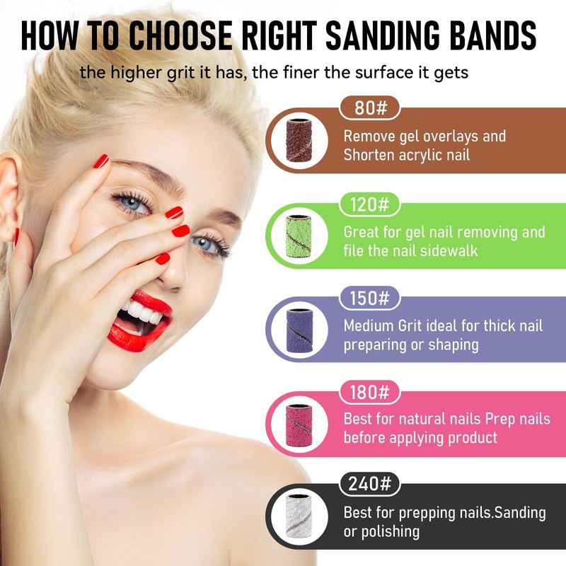 - Nail Drill Sanding Bands Set: You will receive 300 pcs nail sanding bands and 2pcs 3/32” nail drill bits. including 60 brown coarse grit 80#, 60 green medium grit 120#, 60 purple medium grit 150#, 60 pink fine grit 180 # and 60 white very fine grit 240#. The nail drill sanding bits is suitable for most professional nail drills.