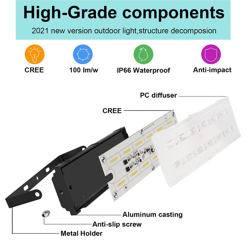 - 【Excellent lamp body design & IP66 waterproof】Our Floodlight made of robust die-cast aluminum housing structural design is waterproof, with breathing holes.. Therefore our floodlight has IP66 waterproof rating, and the advanced heat dissipation design of the lamp body greatly lifespan. Lifespan(50,000 hours) ten times that of the traditional incandescent lightcan be used in heavy rain and heavy snow extreme weather to ensure your safety lighting.