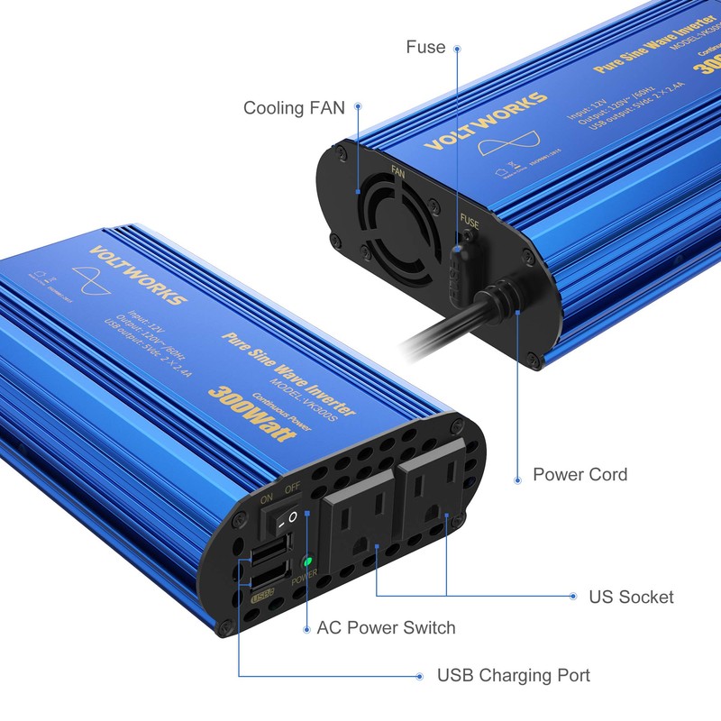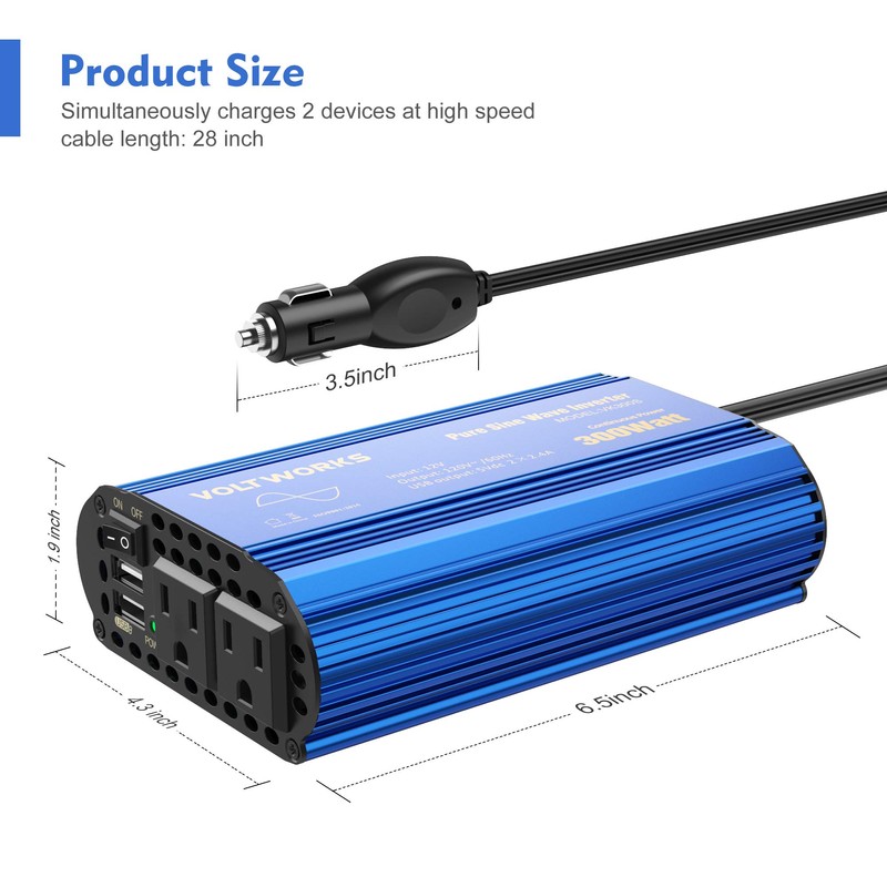 300W Pure Sine Wave Power Inverter for Car Truck RV Adapter DC 12V to AC 110V 120V with 2x2.4A Dual USB Port & AC Outlets by VOLTWORKS