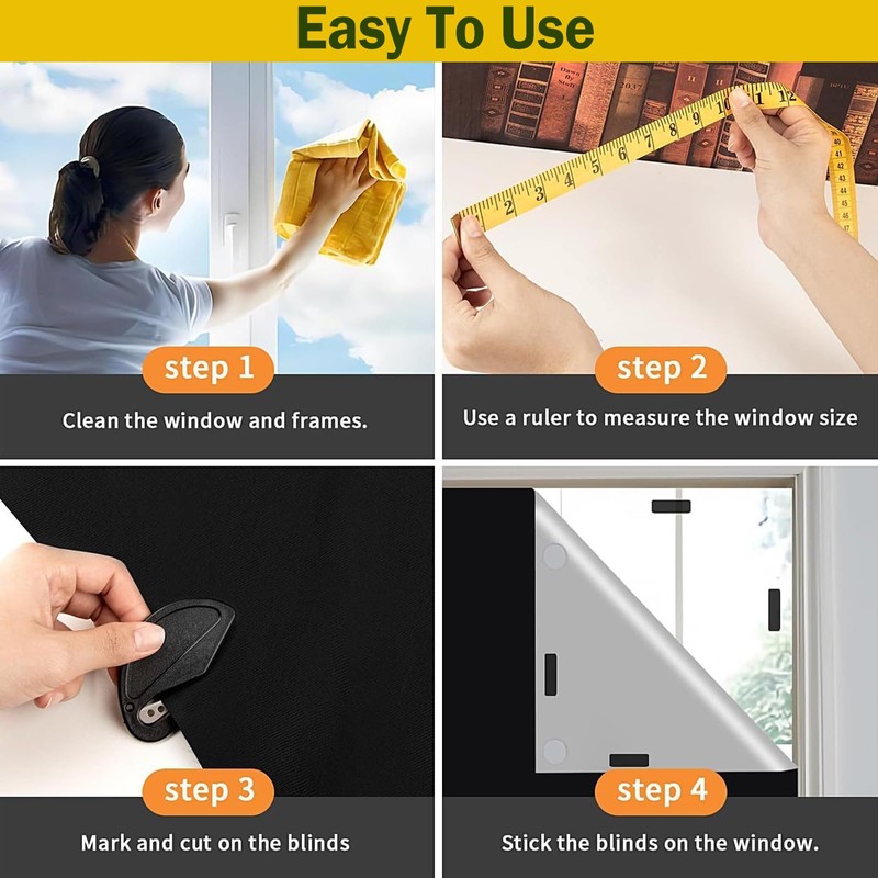 - EASY FIT BLINDS NO DRILLING: this temporary blackout blinds sitck on measures 145 X 300 cm, You can cut it appropriately according to the size and shape of your window. this blinds no drilling can used as skylight blinds, nursery curtains,day and night blinds. Suggest leaving 3 cm when cutting, which is perfect to cover the window edge and block out sunshine.