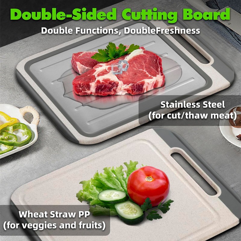 - Double-Sided Cutting Board - The Hipappy cutting board provides versatility with one side made of food-grade 304 stainless steel for thawing or cutting meat, and the other side crafted from wheat straw PP for fruits and vegetables, making it perfect for all your kitchen tasks.