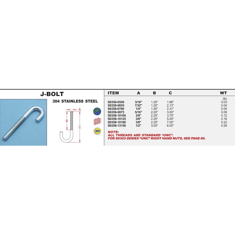 304 Stainless Steel J-Bolt 5/16" (S0358-0875)