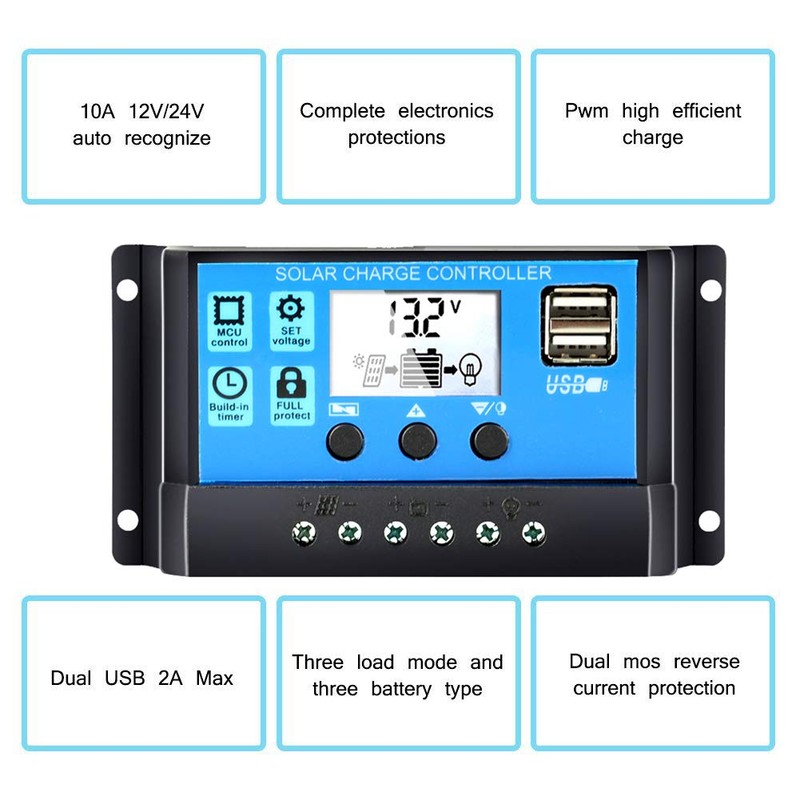- Solar charge Controller with dual USB ports, USB Output: 5V/2A max. 12V/24V auto; Rated Charge & Discharge Current: 30A; Settable operating modes of loads, fully 4-stage PWM charge management.