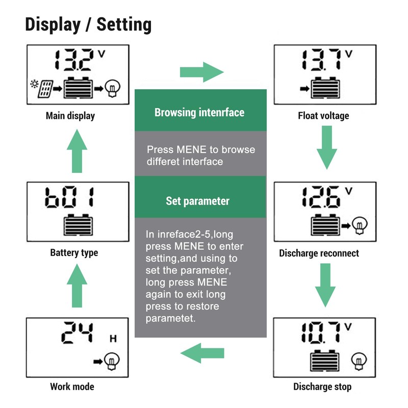 Battery Type: Lithium batteries, customization, GEL,SLD,FLD Load control mode: 24 hours work, light control, light and timing control
