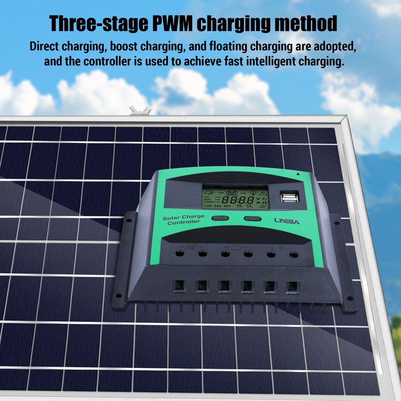 - 30A Solar Charge Controller:Solar panel charge controller has full 3-stage PWM charge management, improving the efficiency of the system. Fully 3-stage PWM regulation charging with direct charge, boost charge, floating charge three-stage PWM regulation charging mode. Using the controller to realize efficient and fast intelligent charging, and effectively extend the battery life.