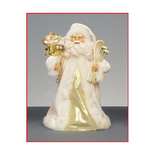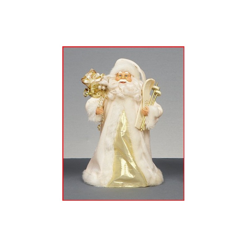 Santa holding skis and a gold sack and tree topper. Dress in ivory and gold. 30cm in height approx. Cropped fur coat.