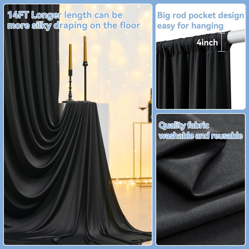- Silky 14Feet Backdrop Drapes Easy for Hanging:The 14ft party background curtain is designed with a 4 inches rod pocket, very easy for hanging nicely without slipping off, suitable for most of backdrop stand. You can tighten or stretch it according to your need.