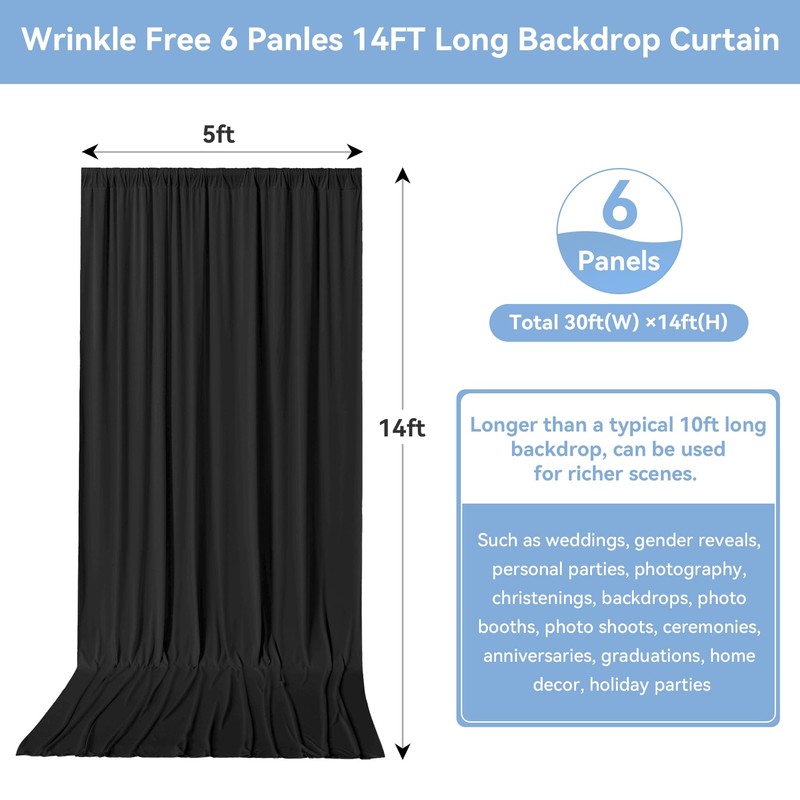 - 14FT Height Black Drapes for Backdrop:Package include 5ft(W) x 14ft(H),6 panels. Our wedding Black backdrop drape is longer than the typical 10ft long backdrop curtain,draping more beautiful. And can be used for richer scenes because it allows us have more room to build a party scene.