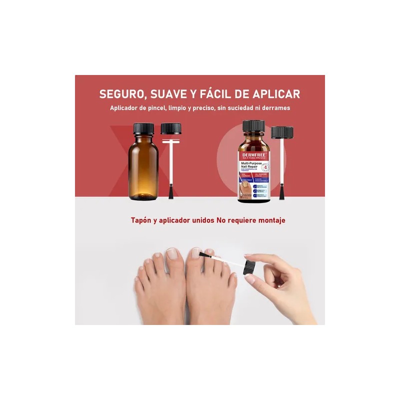 Olvídate de tratamientos engorrosos y complicados. Dermfree se aplica fácilmente, como un esmalte, y su fórmula de rápida absorción trabaja silenciosamente para erradicar el hongo y promover una regeneración saludable de la uña. 🌿 Siente la tranquilidad de saber que estás usando un producto que, además de efectivo, está pensado para tu bienestar, minimizando cualquier irritación y creando el ambiente perfecto para que tus uñas crezcan fuertes y radiantes. Prepárate para ver cómo tus uñas se transforman, recuperando su color natural, su brillo y su vitalidad. ¡Con Dermfree, presume de unas uñas impecables! 💖