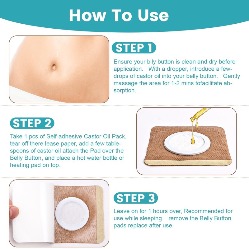 - Our belly button patches are merely an auxiliary tool for using castor oil and do not contain castor oil as part of the product.