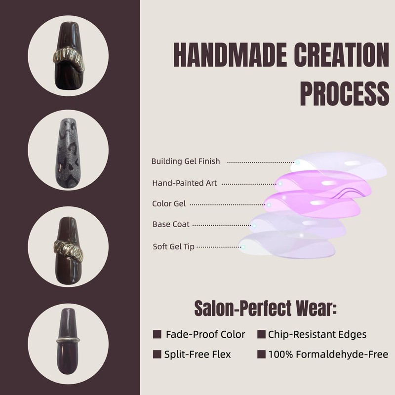 - Premium Materials & Exquisite Craftsmanship – Each nail is crafted from high-quality Japanese gel, offering rich, long-lasting color with a 3D metallic finish. The hand-painted leopard print design adds a touch of sophistication and style, perfect for any occasion.