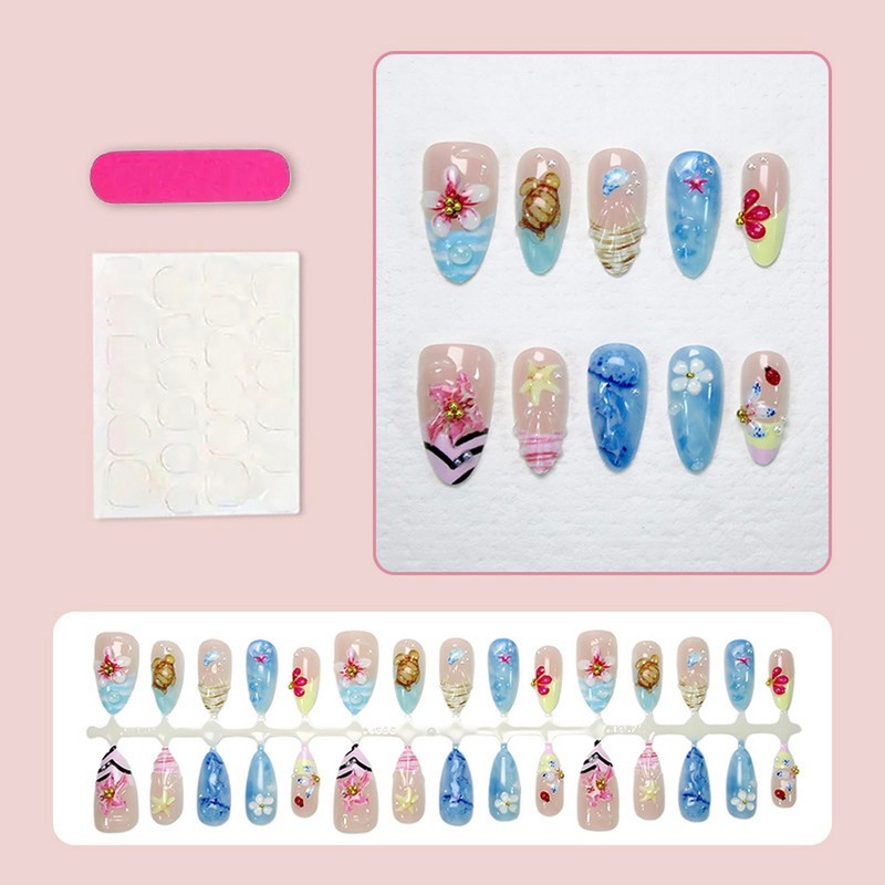 30Pcs Handmade Press on Nails Medium Almond Fake Nails Cute French Tip False Nails with 3D Flower Sea Turtle Starfish Designs Multi-Layer Gel Press on Nails Acrylic Reusable Stick on Nails for Women
