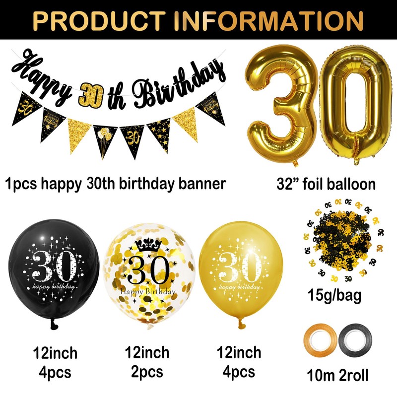 - What You Will Get -- You will receive 1set black gold happy birthday banner, 15g sprinkle table confetti and 10pcs black gold 30th birthday latex balloons, 1set 32inch foil number balloons and 2pcs balloon ribbons, enough to meet your requirements for 30th birthday events and your daily life.
