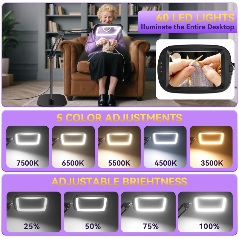 - 5 COLOR TEMPERATURE& BRIGHTNESS ADJUSTABLE: The magnifying floor lamp is equipped with 5 color temperature LED lights, and Level 4 brightness is adjustable. Bright LED lights can illuminate a 4FT table, allowing you to adjust the brightness and color temperature to your desired effect