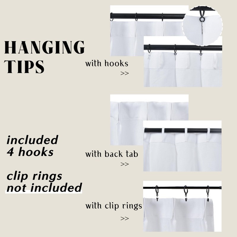 • 3-Way Easy Sliding Hanging Options: Method 1 - With hooks in the pack,simply pin the hooks onto back of curtain as the image shows and pin the other end onto your own curtain rings. Method 2 - If you prefer hiding the tension rod,back tab hanging. Method 3 - With your own ring clips for a more casual style.