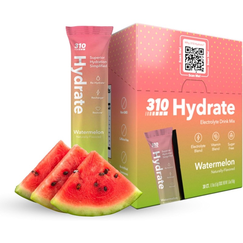 310 Hydrate Watermelon Electrolytes Powder Packets - No Sugar Hydration Packets with Key Vitamins & Minerals - Keto Friendly - Tasty Sugar Free Electrolyte Drink - 30 Single Servings