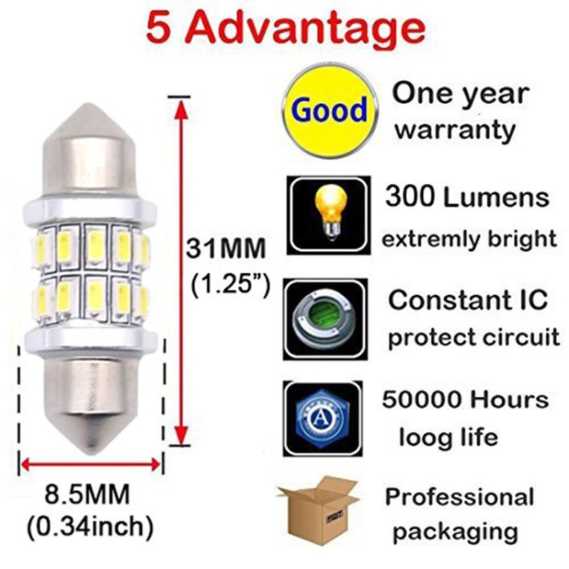 - Package included: 2pcs of Boat Festoon LED bulbs, Voltage: DC 12V, Output Power: 12V @ 0.15A, Flux:300Lumens, Width: 8.5mm(0.34inch), Length: 31mm(1.25inch). Please confirm the length of your stock bulb is 31mm(1.25inch) before purchasing.