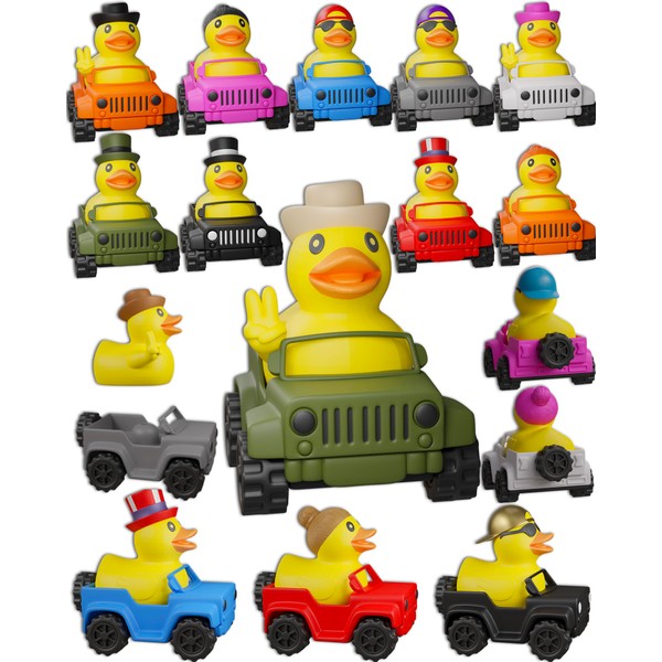 - Remix ducks and jeeps for endless combinations - a special designed socket allows for disconecting and reconcting ducks from jeep - with 8 color jeeps and 16 unique ducks, you can be sure that you will find the combintion that perfectly refelcts the personality of the jeep you are ducking.