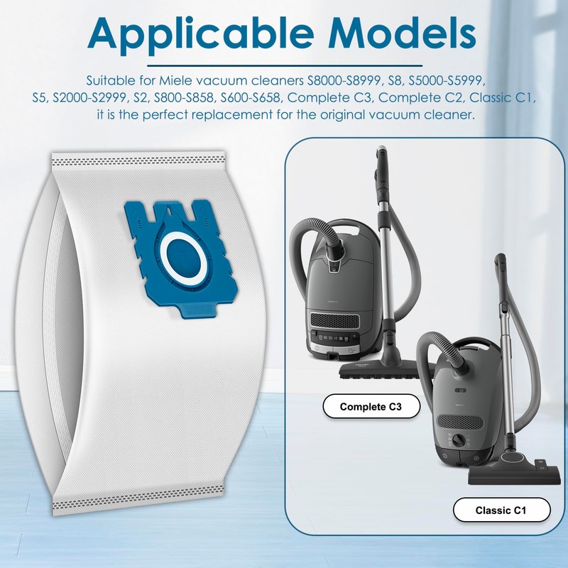 - 【Perfect Compatibility】The replacement dust bag and filter package are compatible with Miele GN vacuum cleaner Classic C1, Complete C2, Complete C3, S400i - S456i, S600 - S658, S800 - S858, S2000 - S2999, S5000 - S5999, S8000 - S8999999, S227/ S240, S270/ S280, S400, S2000, S5000 and S8000. Please kindly check your vacuum cleaner model before the order. Please be noted that: This is not an OEM product. Any use of the brand name or model name is intended solely to demonstrate compatibility of this product.