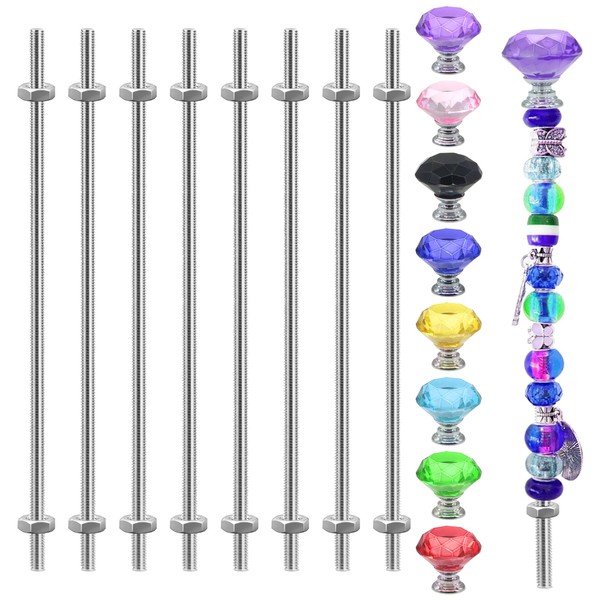 32 Pack 8/32 Stainless Steel Threaded Rods for Beads with Crystal Knobs, Include 8 Pcs M4 Fully Threaded Rod with 16 Pcs M4 Hex Nuts and 8 Pcs Mixed Color Crystal Knobs Set(10inch)