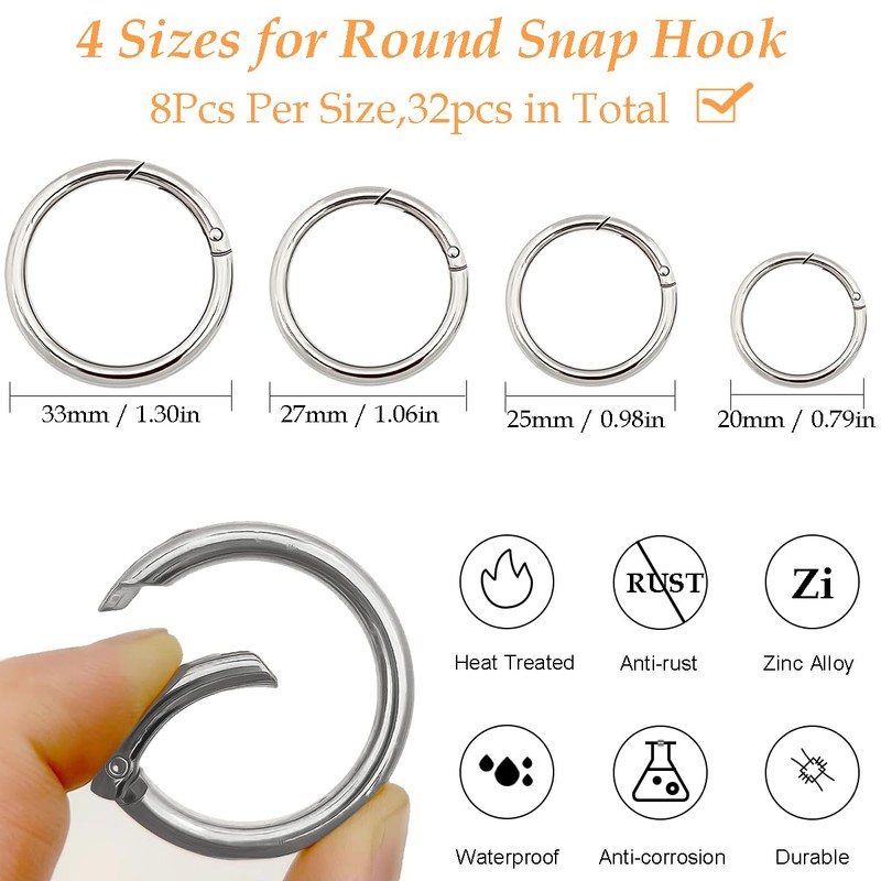 32 PCS Spring O Ring Set, Circle Carabiner Clip in 4 Size, Zinc Alloy Round Carabiner Snap Trigger Buckle (Silver)