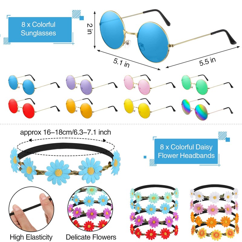 - Bonita combinación: recibirás 8 piezas de collares con el signo de la paz, 8 piezas de diademas con flores de margaritas, 8 pares de pendientes con el signo de la paz y 8 pares de gafas de sol de colores, la gran cantidad y las combinaciones completas son suficientes para satisfacer tus necesidades de vestirte y uso diario.