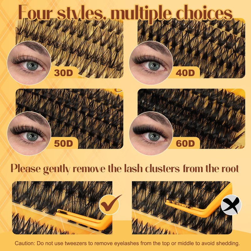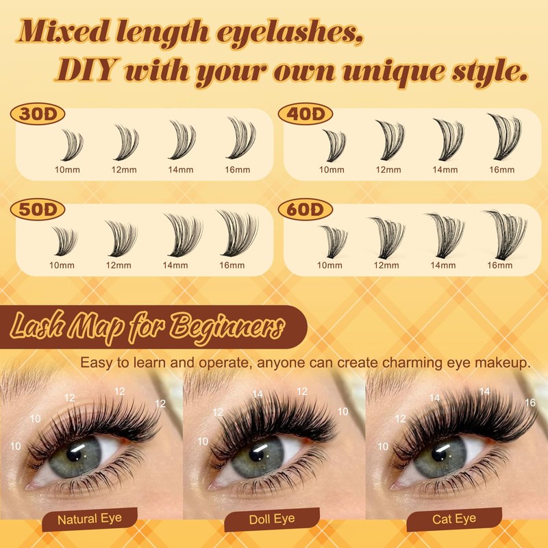 - Mixed Length Combinations: 3-piece lash extension kit combines 30+40+50+60D lash clusters of different lengths. By matching these eyelash clusters of different lengths together, you can create different styles of makeup. It's easy to achieve any lash style you want.